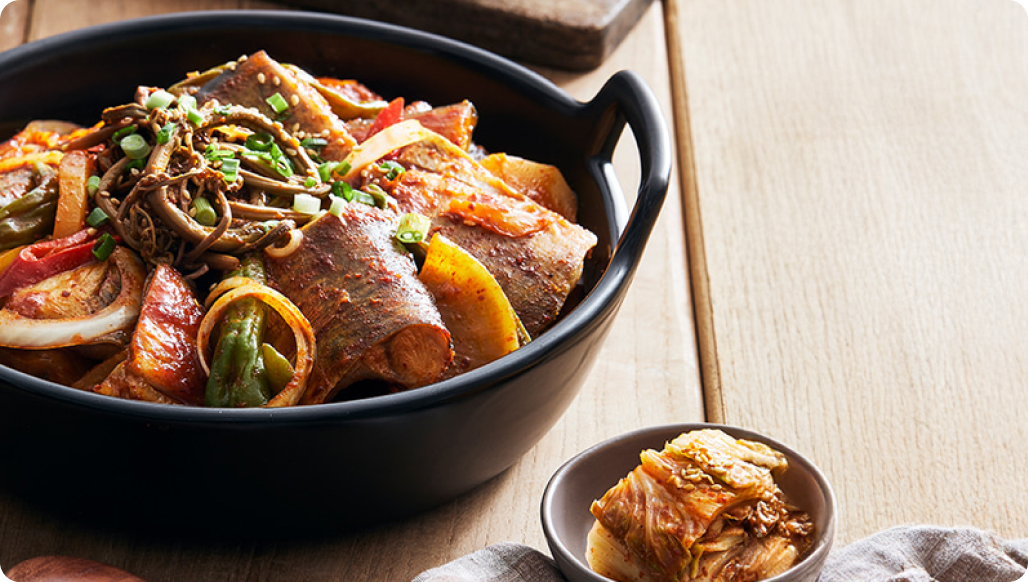- 2 무와 감자, 시래기를 썰어 냄비 바닥에 깔아준다.