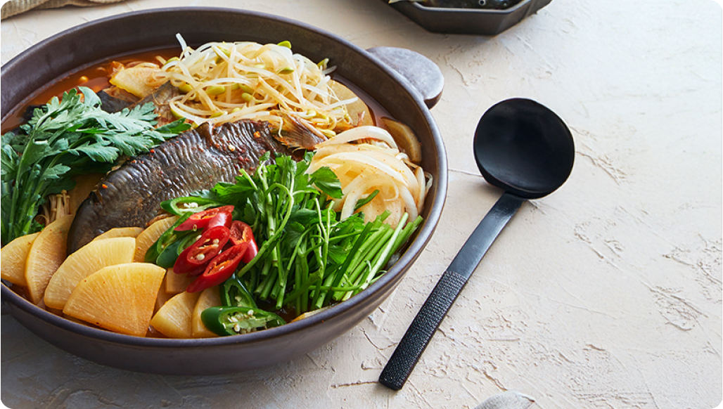 - 3 그 위에 메기와 민물새우를 얹고 물과 양념장을 넣은 후에 약 20분 정도 강불로 끓인다.